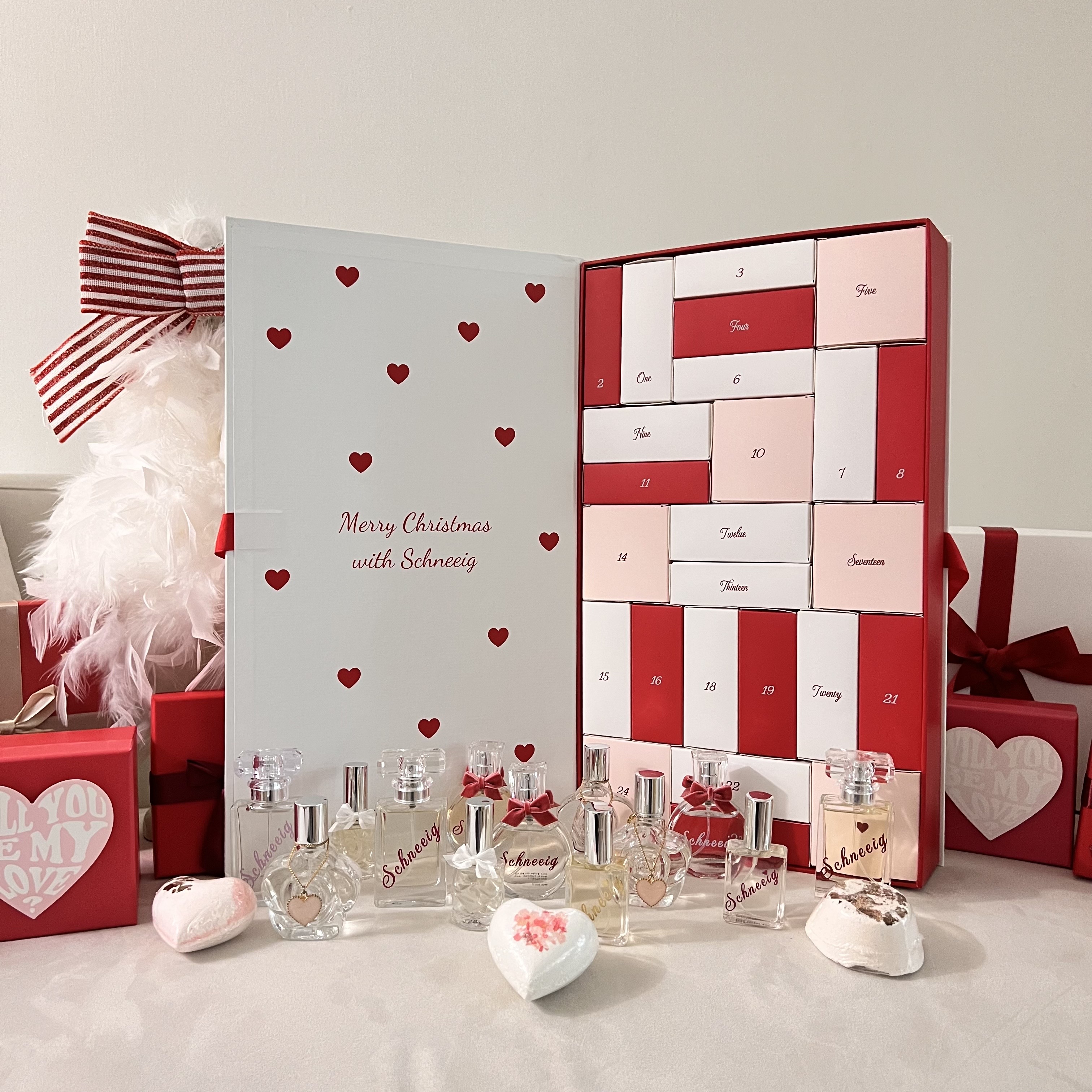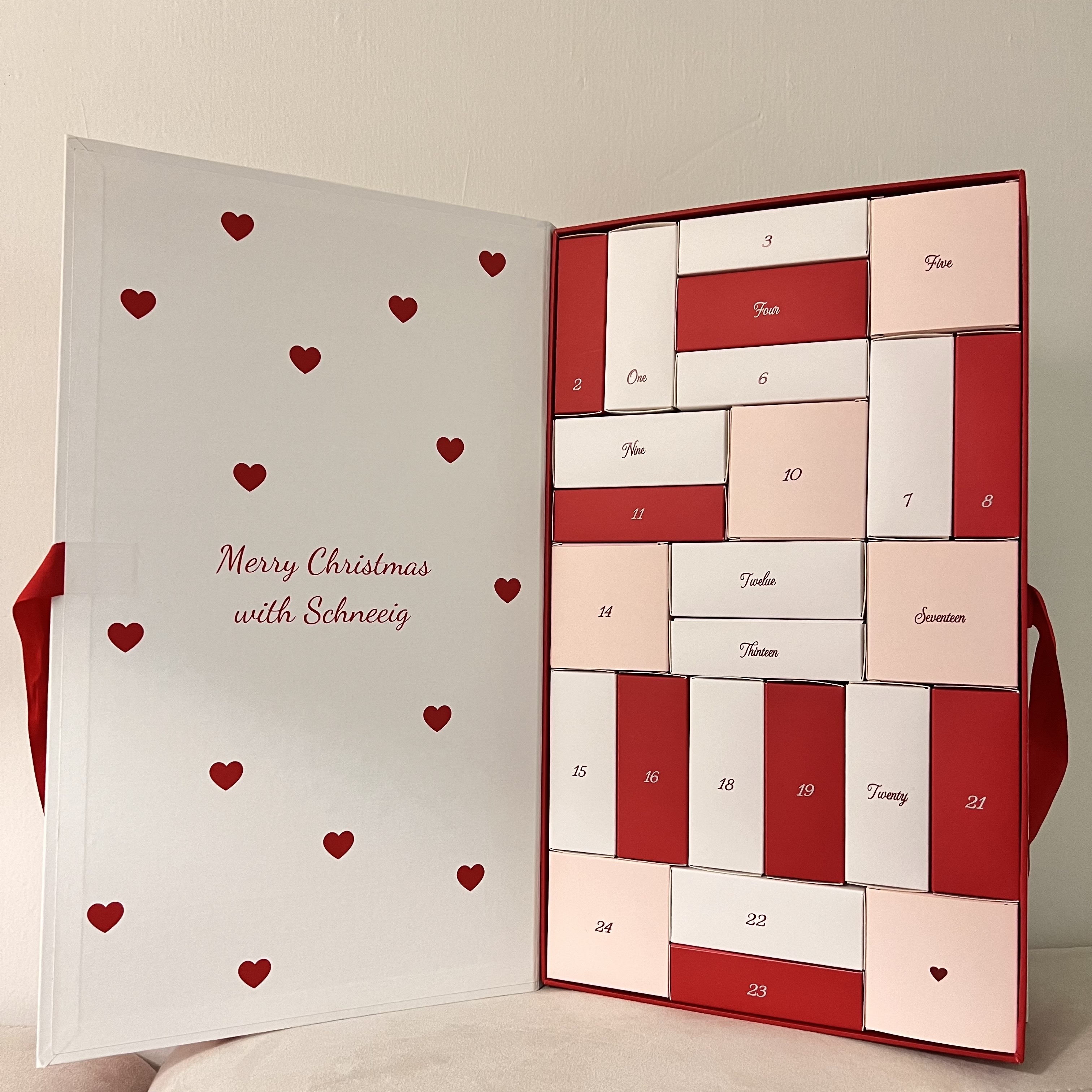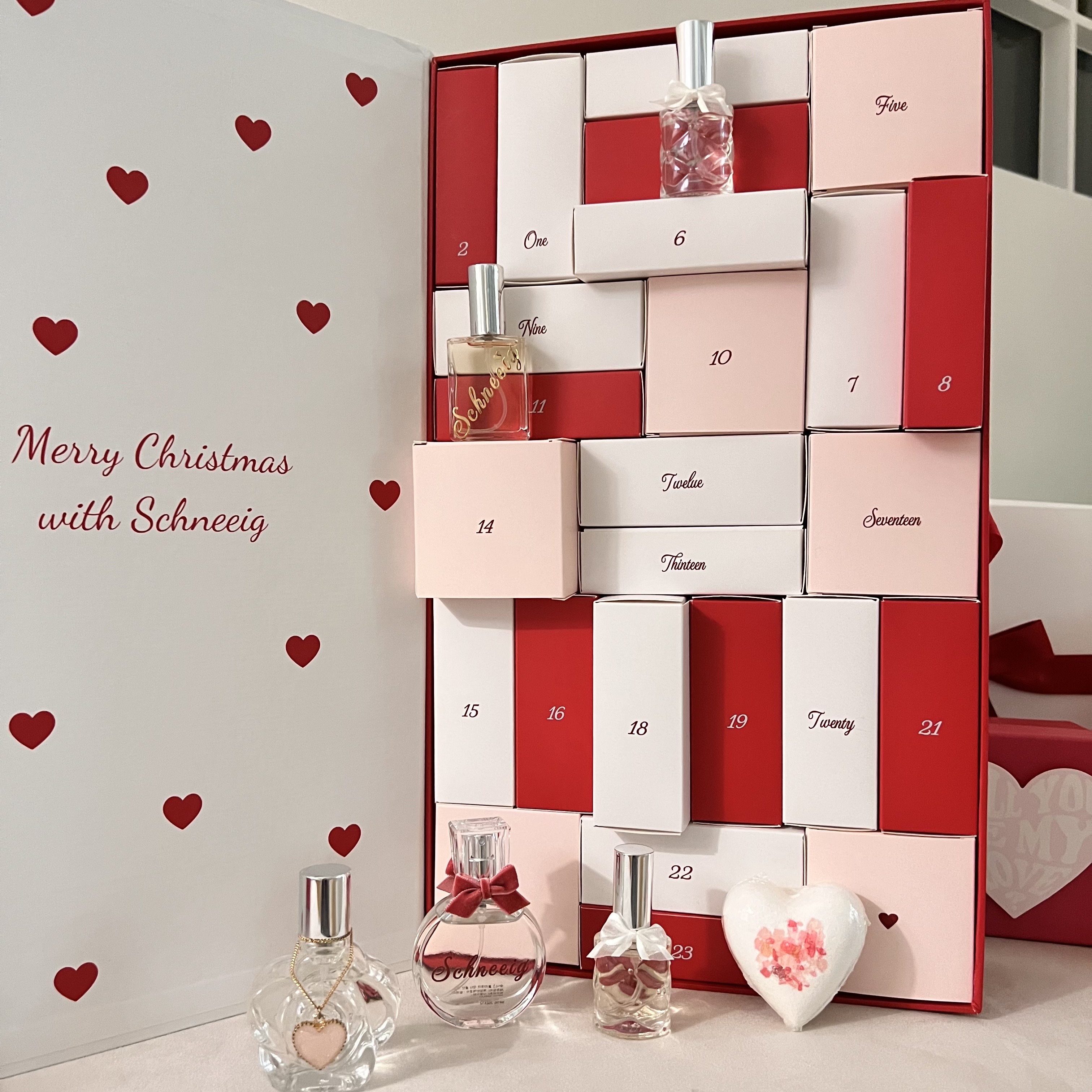 슈니그 어드벤트 캘린더는 한국에 하나밖에 없는 뷰티 어드벤트 캘린더 제품으로 여자친구 화이트데이 선물로 제격에요 화이트데이나 크리스마스 특별한 날에 선물하기 딱 좋게 깔끔한 하트 박스에 화이트, 레드, 핑크컬러로 박스를 열어보면 1번부터 24번까지 숫자가 적혀있는 작은 박스들이 담겨있어요 숫자가 안 적힌 하나의 빈 상자가 있는데 거기엔 선물하는 사람이 개인적으로 반지나 편지 등 을 넣어 선물할 수 있어서 더 특별한 선물이 될 수 있을 것 같아요 작은 박스 안에는 14가지의 향수와 5가지의 배쓰밤, 그리고 룸 퍼퓸이 들어가 있는데 다 다른 향기라 그날 기분에 따라, 또 분위기에 따라 향을 골라 쓸 수 있는 재미도 있답니다 포장상자를 열어보면 큐알코드가 있는데 카메라로 스캔해 보면 해당 제품에 대한 설명과 용량 사용기한에 대해서도 살펴볼 수 있더라고요 유명한 브랜드 향과 비슷한 향도 있고 하나하나 겹치는 향 없이 향들이 다 고급스럽고 좋아서 아직도 잘 사용하고 있는 제품이에요 뷰티에 관심 많고 센스 있는 화이트데이 선물을 하고싶으시다면 추천드려요 정말 센스있는 선물이란 재미와 감동을 주는 슈니그 어드벤트 캘린더 같은 제품이 아닐까요